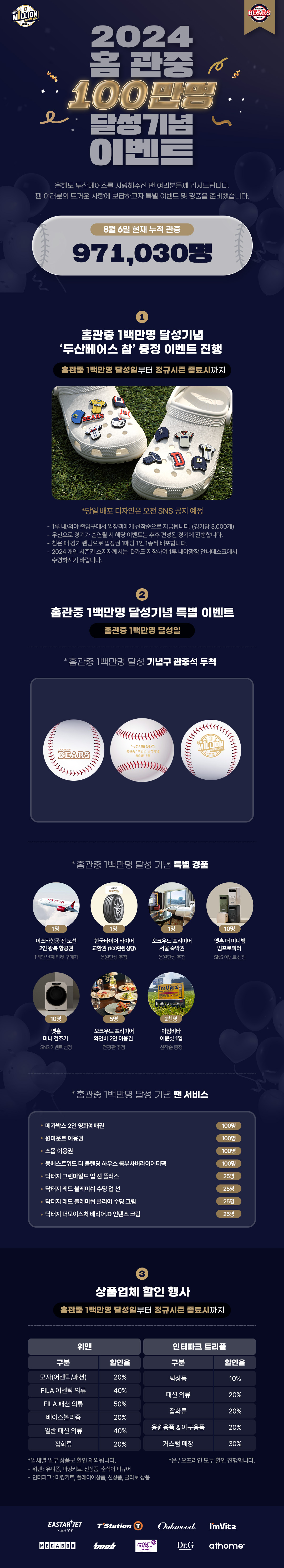 두산 베어스 경기는 두산 베어스 공식 홈페이지에서 티켓을 예매할 수 있습니다. 예매를 위해서는 회원가입이 필요하며, 다양한 포인트 혜택도 제공됩니다. 두산 베어스 100만 이벤트는 경기당 선착순 3000개씩은 놓칠 수없지요!!!